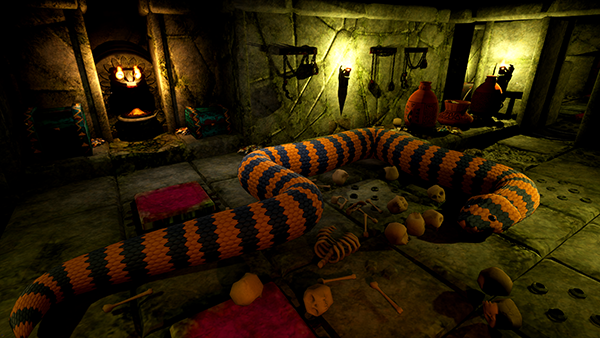 Deep in her lair slumbers an avatar of the goddess Snek, guardian of her secret and mysterious temple. When raiders and grave-robbers come seeking ancient treasure, the stern priestesses sound the alarm and Snek awakens to defend the temple, monch the infidels, and grow and grow and grow...